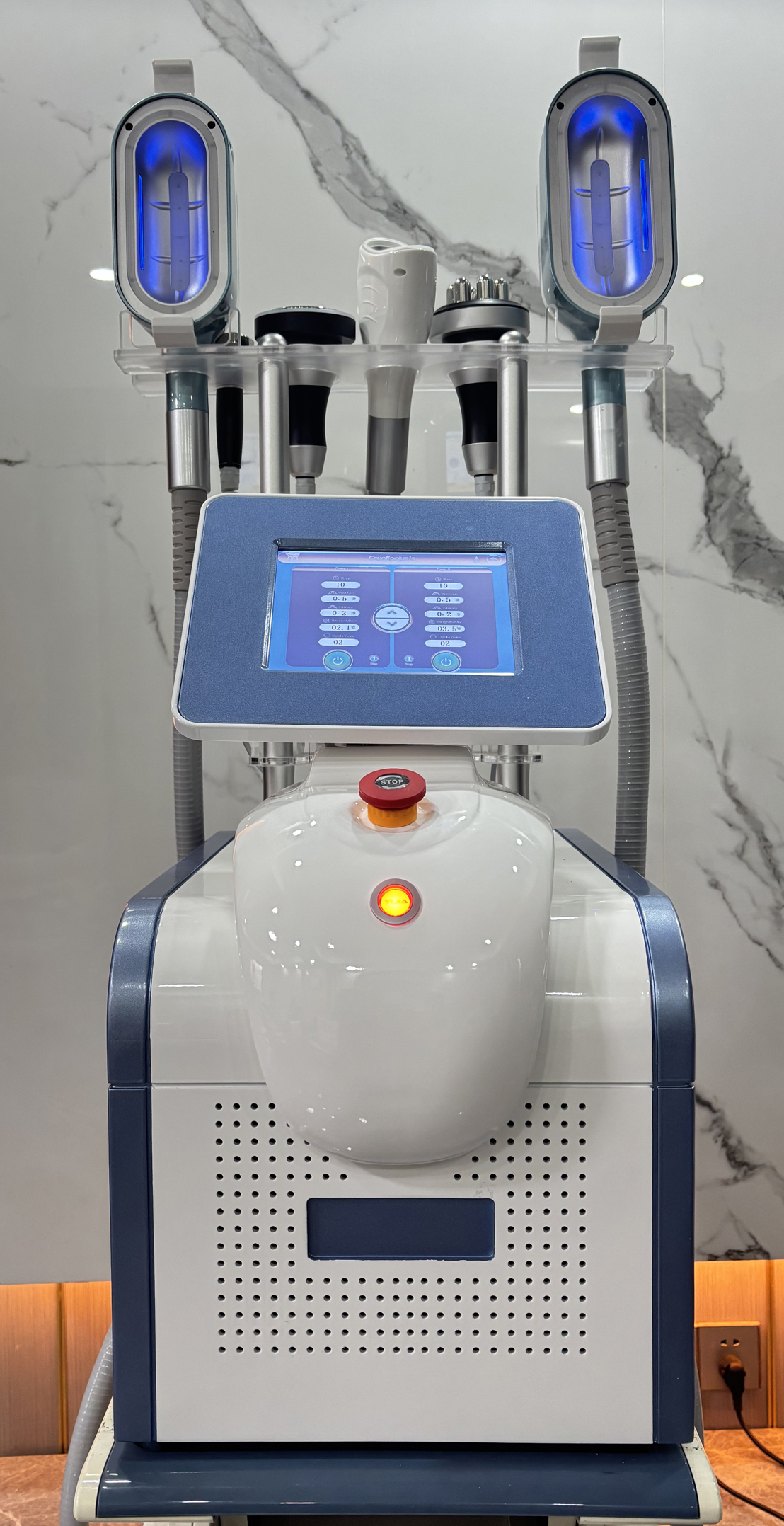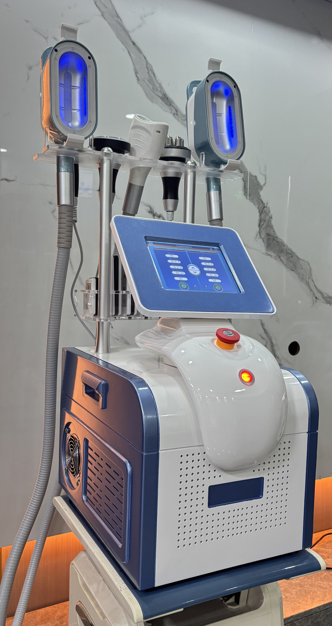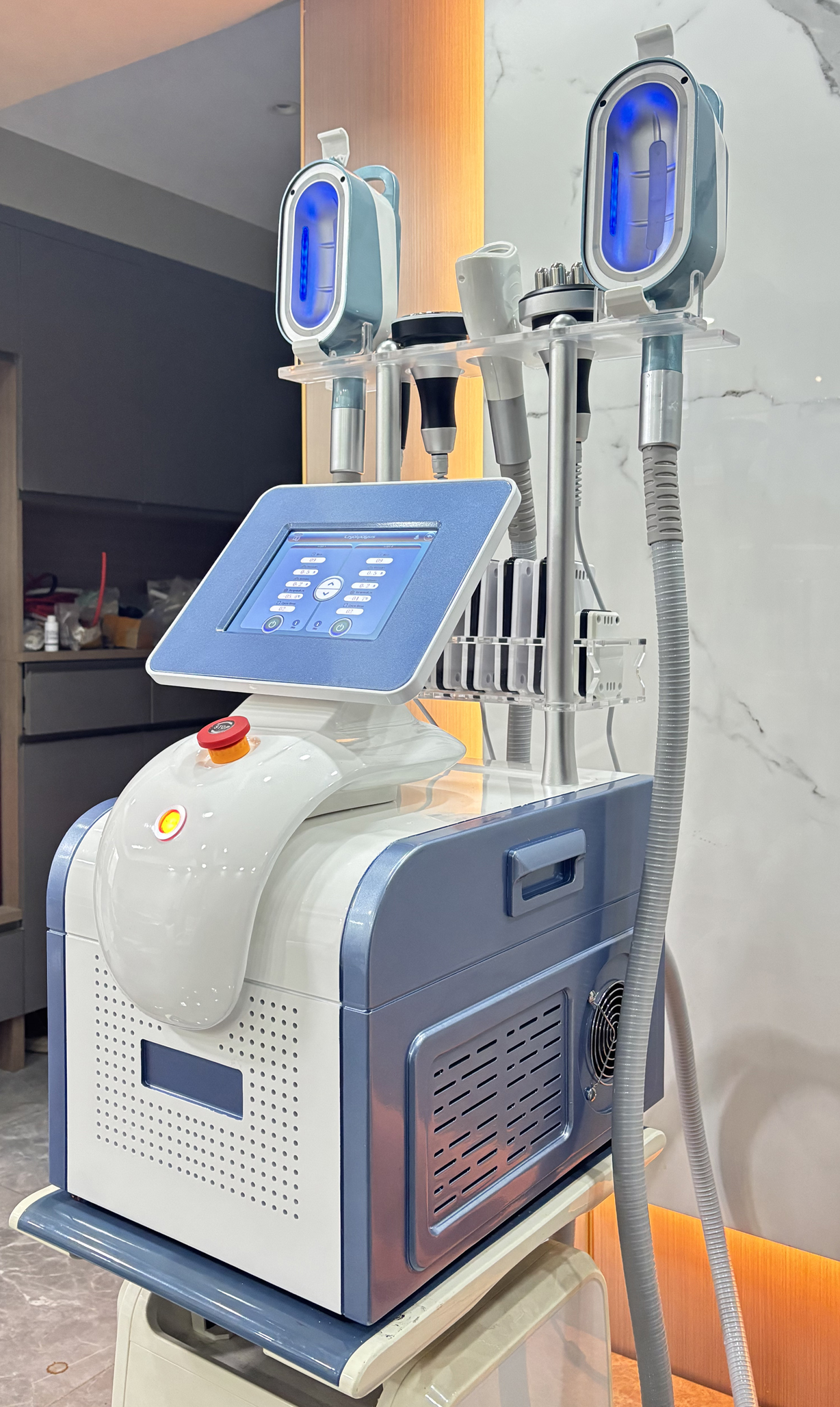Equipped with multiple cooling cryo handles and a smart touch screen, it supports simultaneous treatments on different body areas for enhanced efficiency. Suitable for use on the abdomen, thighs, waist, arms, and back.