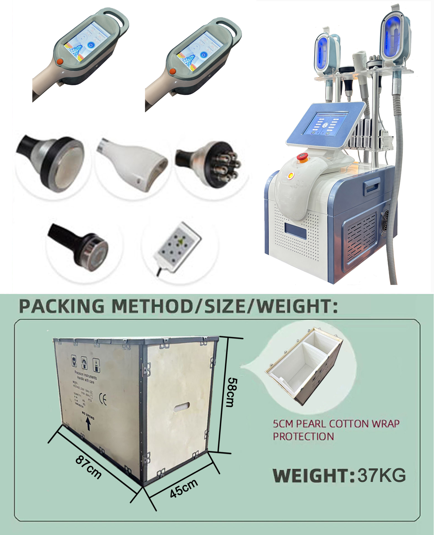 This advanced 6-in-1 body sculpting machine integrates 360-degree cryotherapy fat freezing, radio frequency (RF), ultrasonic cavitation, and lipo laser technologies to provide a powerful, non-invasive solution for localized fat reduction, skin tightening, and body contouring.