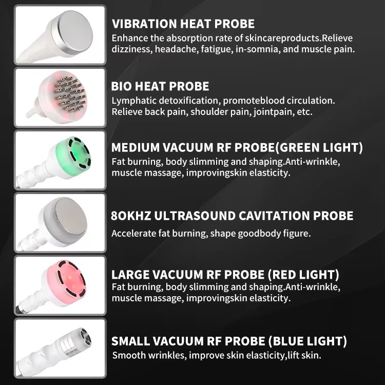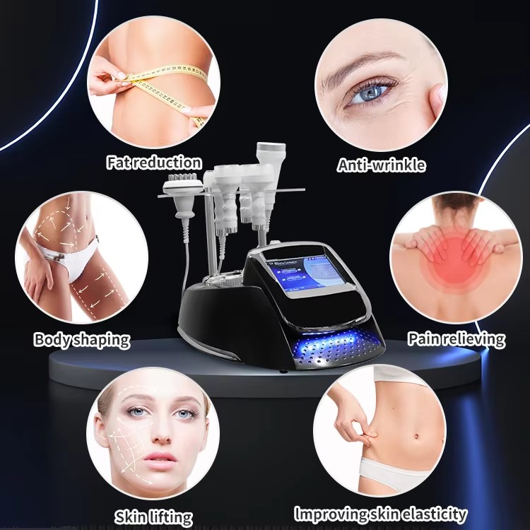 This 6-in-1 multifunctional beauty device combines 40K cavitation, radio frequency (RF), and vacuum technologies to target fat reduction, body contouring, and skin tightening. Commonly used in professional aesthetic clinics or at home for facial lifting, wrinkle removal, cellulite reduction, and body sculpting. Suitable for use on face, arms, abdomen, thighs, and buttocks.
