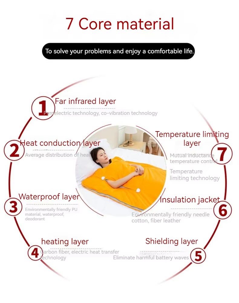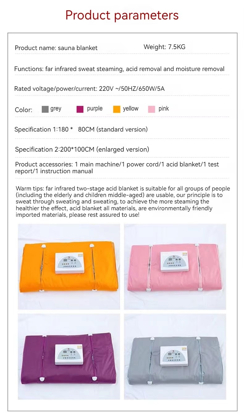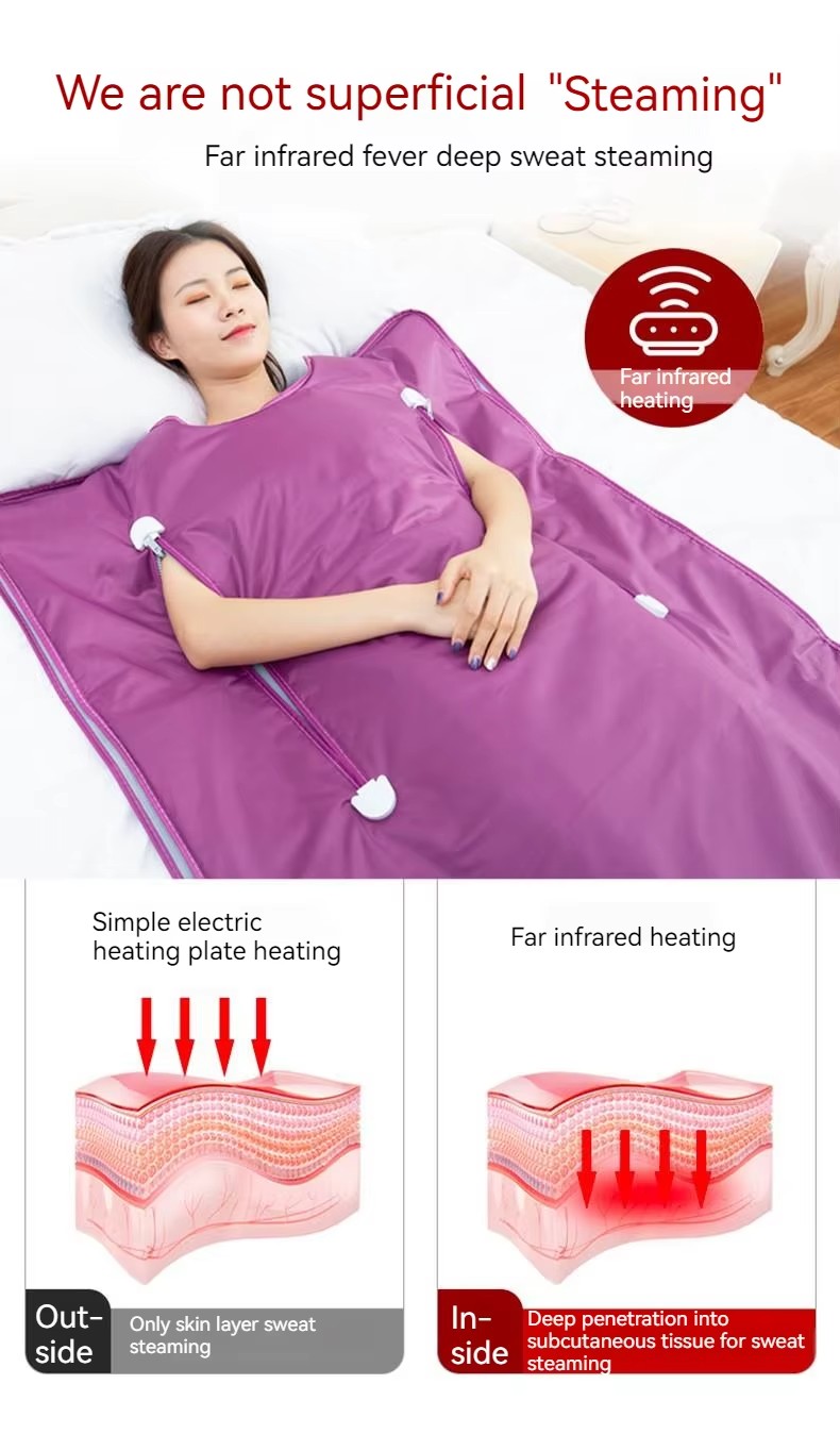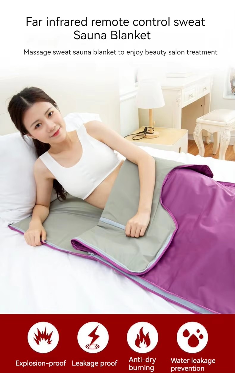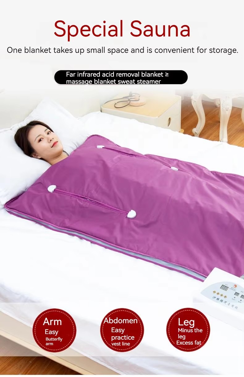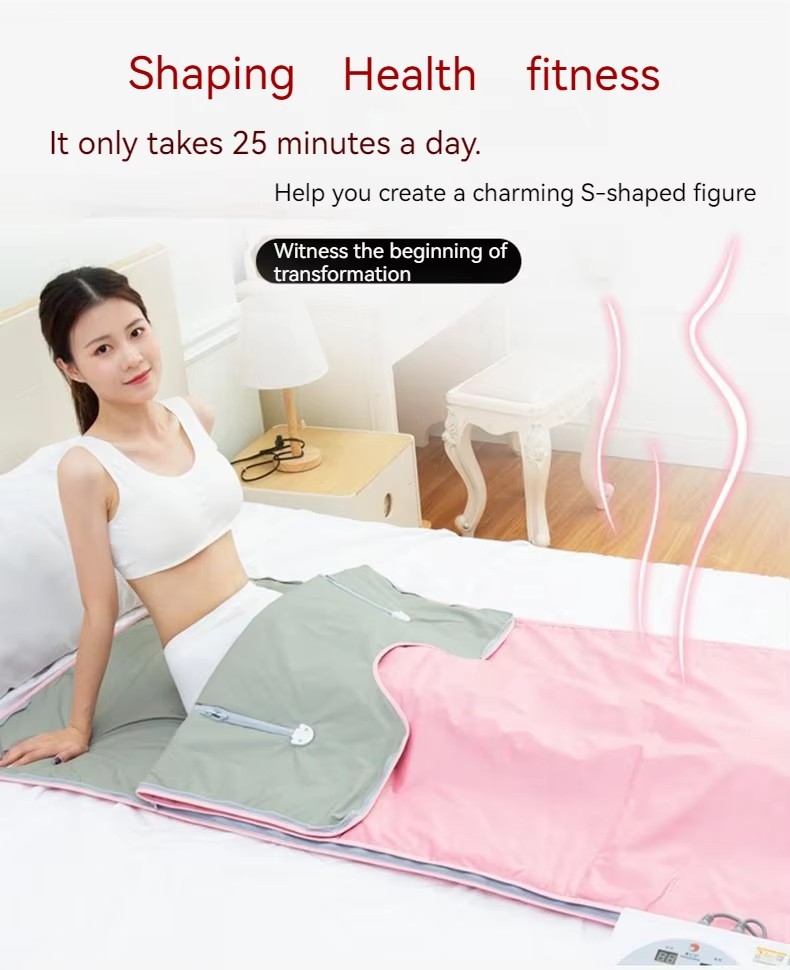 This portable FIR (Far Infrared Ray) sauna blanket is designed for home or professional spa use. It promotes full-body detoxification, accelerates fat burning, and supports body shaping through deep infrared heat. With adjustable temperature and timer settings, it enhances blood circulation, relieves muscle soreness, and helps with stress reduction and skin improvement. Compact, foldable, and easy to use.